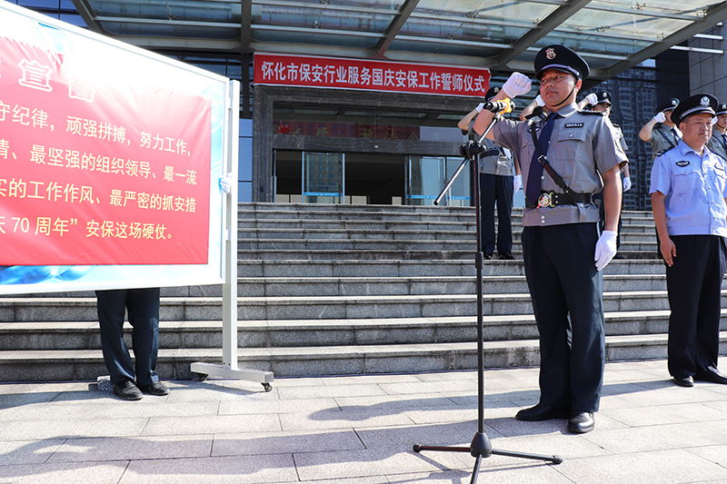 启动仪式由谢洪民主持,怀化金剑保安服务有限责任公司董事长向其华、怀化市保安服务有限责任公司副总经理李运林在启动仪式上代表全市保安服务单位先后作了坚持“不忘初心跟党走,牢记使命勇担当”、坚持“践行新使命,忠诚保大庆”表态发言,怀化市保安服务有限责任公司守押大队表演了队形和拳术,全体与会队员进行了服务国庆安保工作誓师宣誓。
