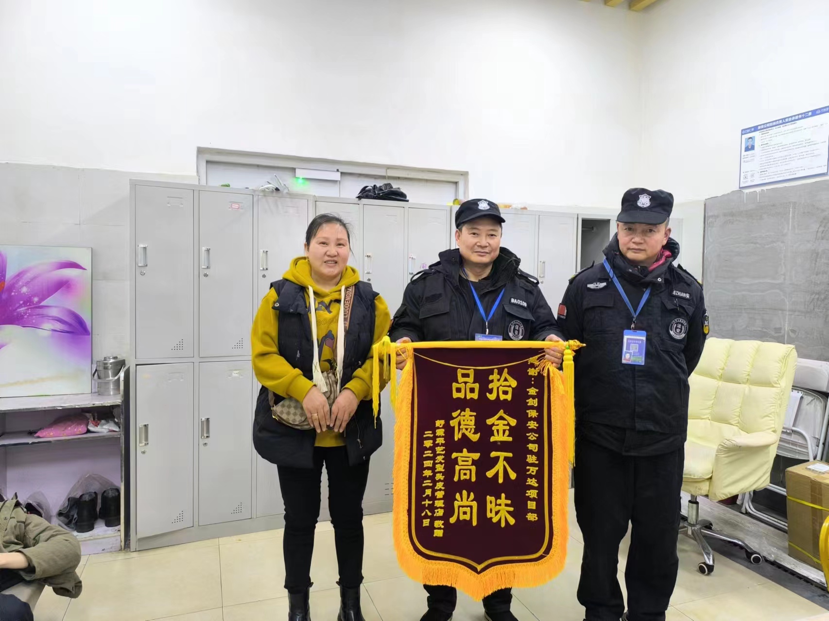 2024年2月18日,失主武晓兰专程从溆浦县赶到怀化金剑保安服务有限责任公司驻万达保安队赠送锦旗,对该公司保安彭满娃拾金不昧的行为表达感谢。