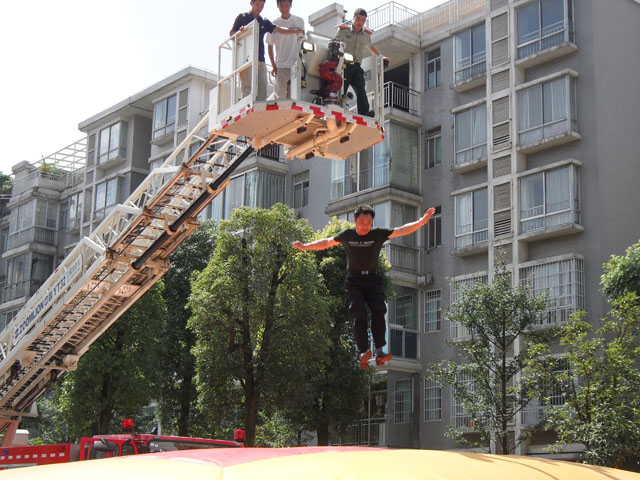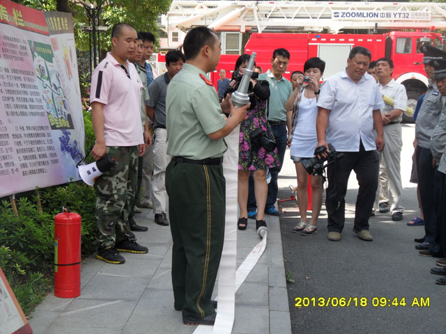 首先进行的是由市消防支队老班长主讲的消防安全常识,通过实例及消防战士们救火的亲身经历,告诉我们怎样最有效的防火及在家庭着火的情况下怎样最大程度的减少损失和保全生命,详细介绍并现场演练了各种消防器材的使用及注意事项。进行的第二个内容是在紧急情况下怎样最有效的逃生方法,通过救生气垫或能够代替救生气垫的棉被等物件最大程度的提高着火点人员跳楼的损伤,金剑保安公司保安人员及物业公司员工都积极主动的参予其中。第三个内容也是最惊险的内容,由消防战士表演了失火情况下利用床单或窗帘等物件织成绳,从窗口滑下的逃生方法。